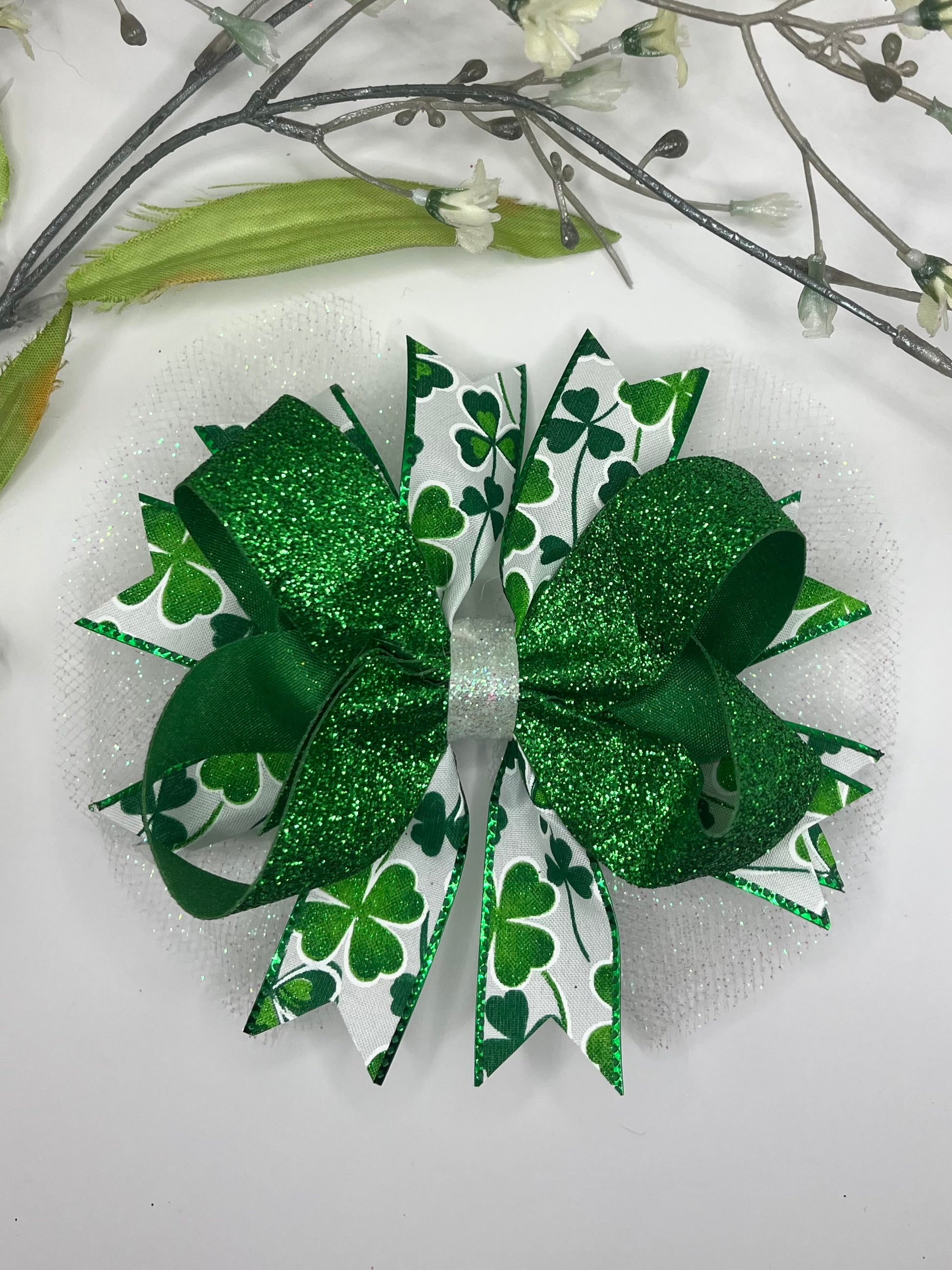 Green clover triple layer printed clip in hair bow. 5" edge to edge. Metal alligator clip.